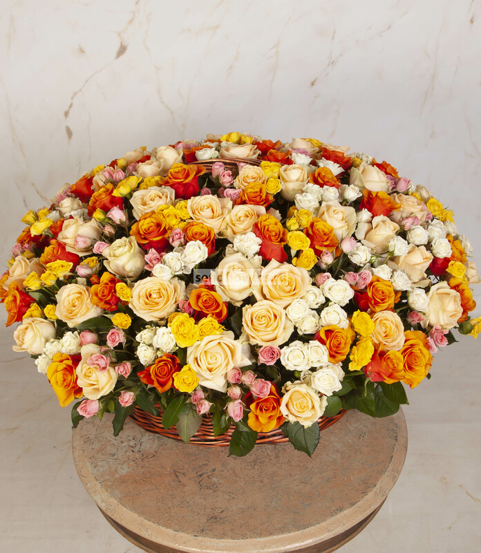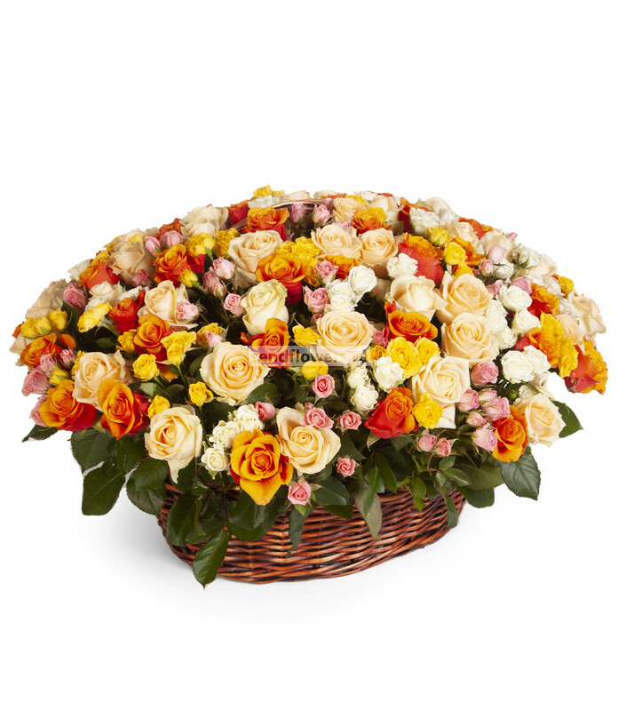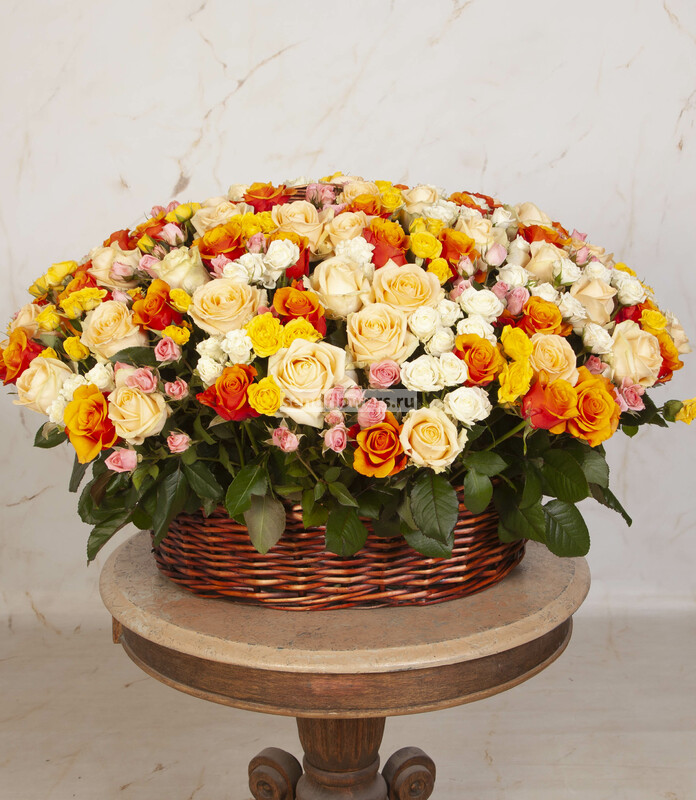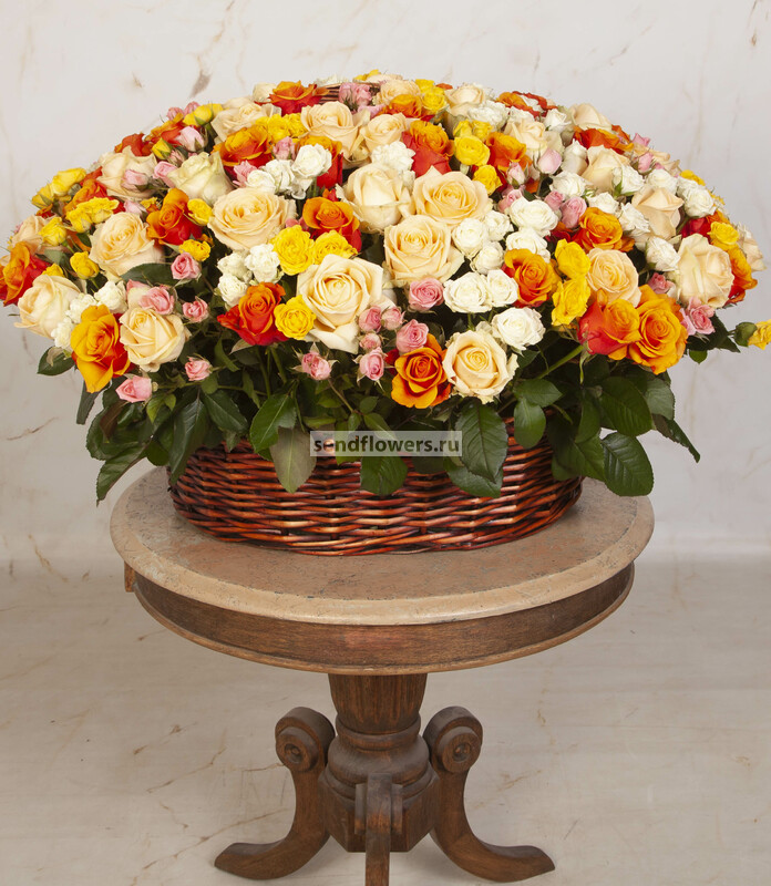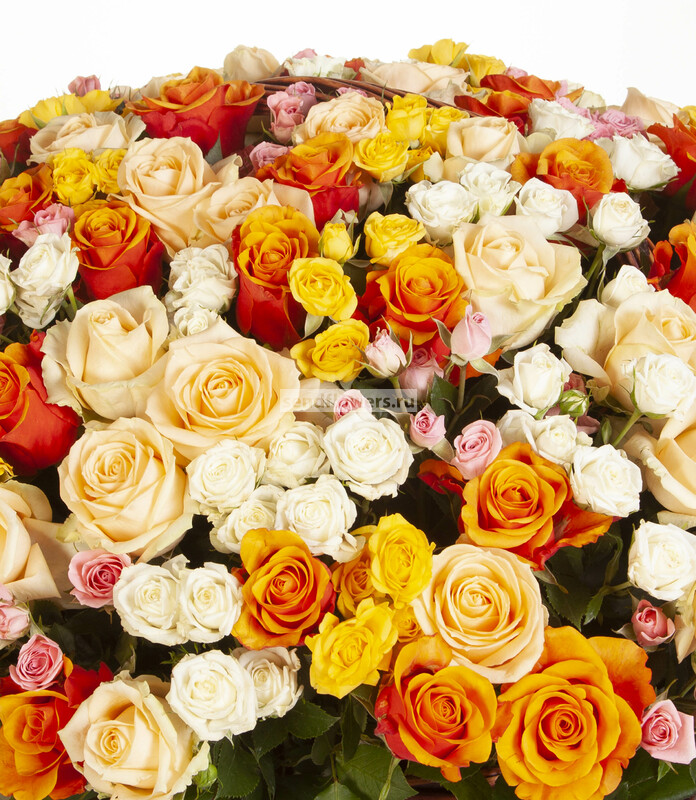 Состав: Оазис кирпич (15), Роза Espana (65), Роза кустовая розовая (32), Роза кустовая белая (32), Роза кремовая (70), Роза кустовая желтая (32), Корзина под 301 розу/501 тюльпан (1)