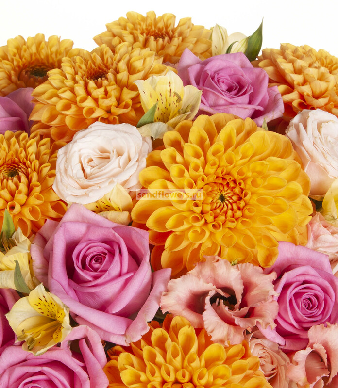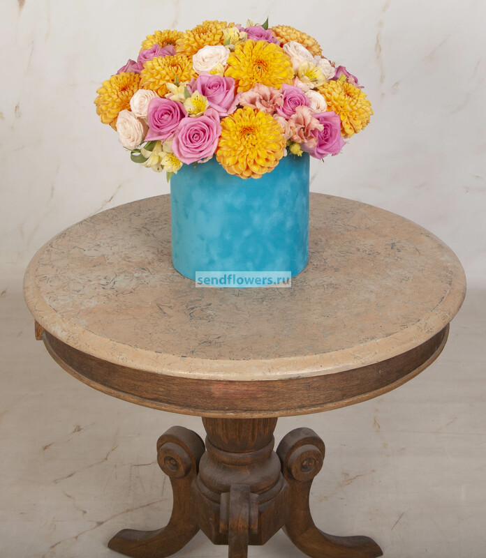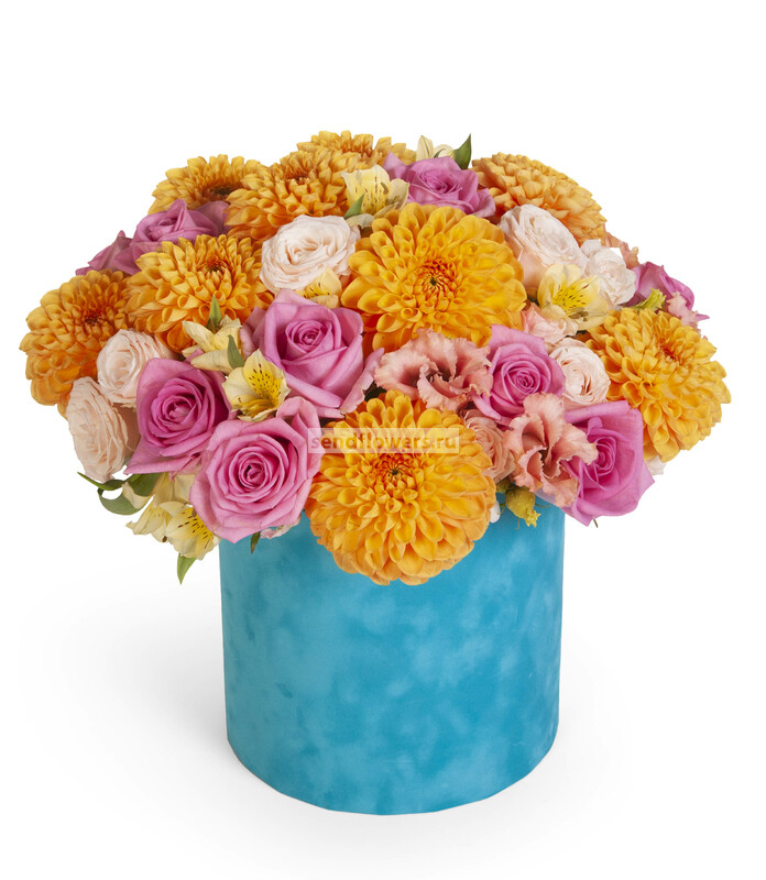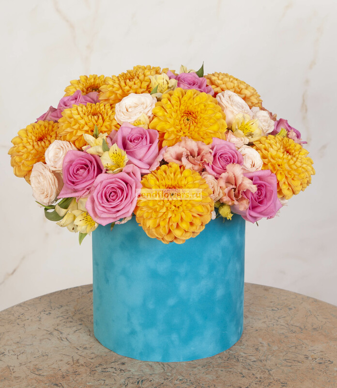Состав: Оазис кирпич (2), Альстромерия желтая (5), Роза розовая (13), Роза Bombastic (5), Эустома кремовая (4), Коробка бархатная голубая (1), Хризантема одноголовая Rossano Orange (9)