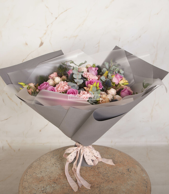 Состав: Эвкалипт (1), Лента натуральная (3), Роза розовая (7), Гвоздика розовая (3), Эрингиум (2), Роза Bombastic (2), Эустома кремовая (2), Пленка матовая (2)