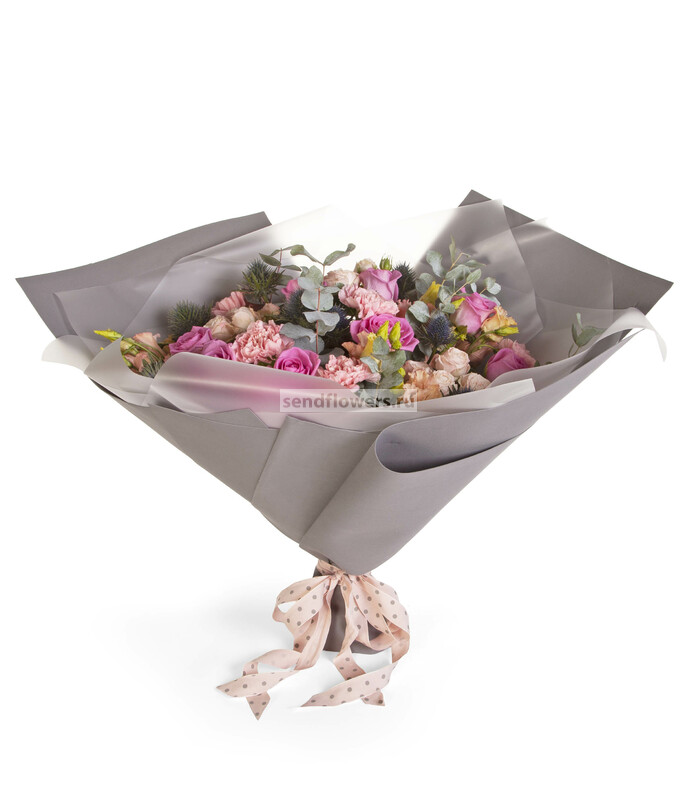 Состав: Эвкалипт (3), Лента натуральная (5), Роза розовая (11), Гвоздика розовая (7), Эрингиум (6), Роза Bombastic (6), Эустома кремовая (4), Пленка матовая (4)