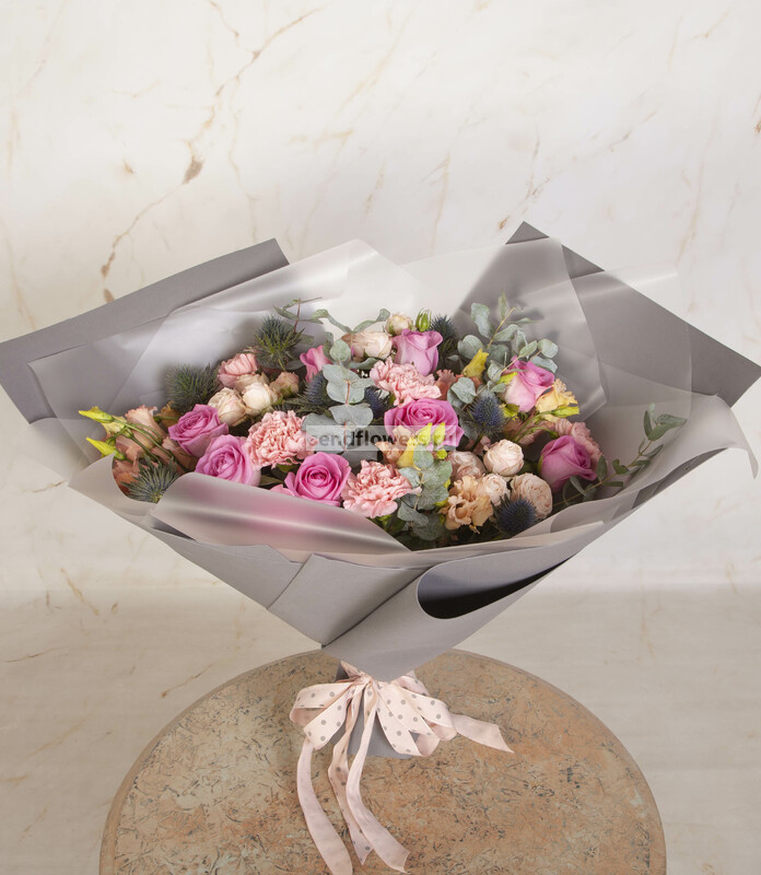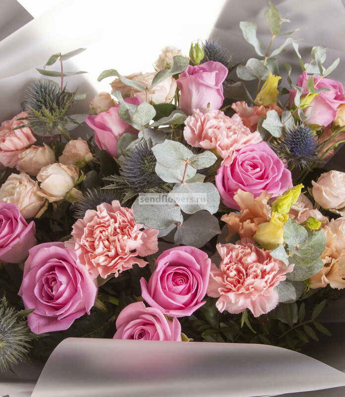 Состав: Эвкалипт (2), Лента натуральная (4), Роза розовая (9), Гвоздика розовая (5), Эрингиум (4), Роза Bombastic (4), Эустома кремовая (3), Пленка матовая (3)