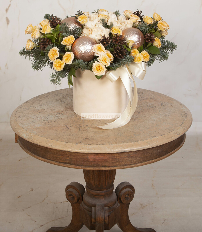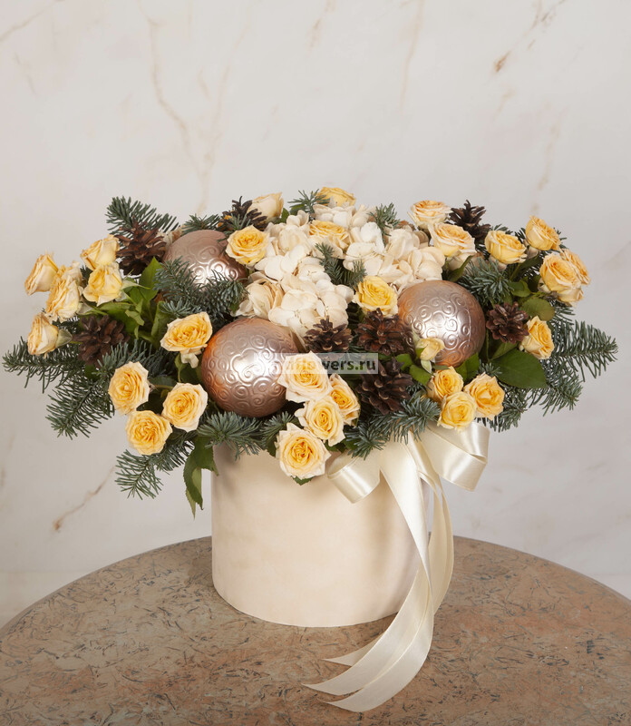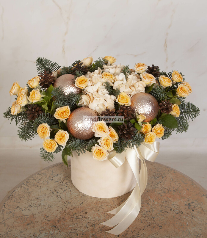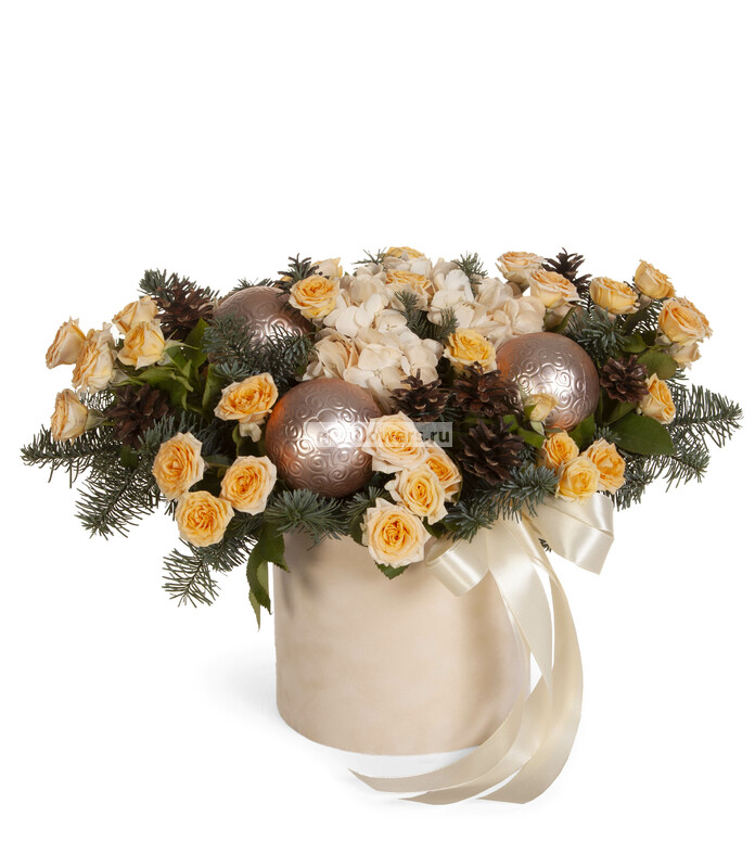 Состав: Оазис кирпич (2), Лапник (1), Лента натуральная (5), Шар новогодний стандартный (пластик) (3), Шишка натуральная (10), Роза кустовая кремовая (10), Гортензия кремовая СО (1), Бархатная коробка бежевая (1)